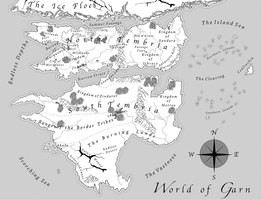 For two centuries, the five great kingdoms of North and South Tembria had been bound by the Covenant: the solution to centuries of warfare over control of the Narrows, the sea passage between the two continents. It was the choke-point at which two outcrops of land had created a passage so constricted that no more than half a dozen ships – three eastbound and three westbound – could navigate and pass safely at the same time. The need to reduce speed here and the overlooking rocks had made this the most prized location on Garn, for whoever controlled the straits controlled all east–west shipping across two continents; the alternative sea routes around the north or south of the twin continents were so difficult and time-consuming that they were considered to be close to impossible. Alternative land transport would take triple the time, and twice the cost.