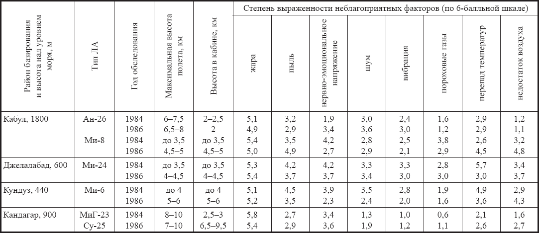 Таблица 2.5 – Сравнительная оценка выраженности основных неблагоприятных факторов полета в Афганистане