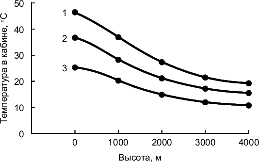 Рисунок 2.1. – Зависимость температуры воздуха в кабине вертолета Ми-24 при температуре воздуха в тени 40 (1), 30 (2) и 20°С (3) от высоты полетов