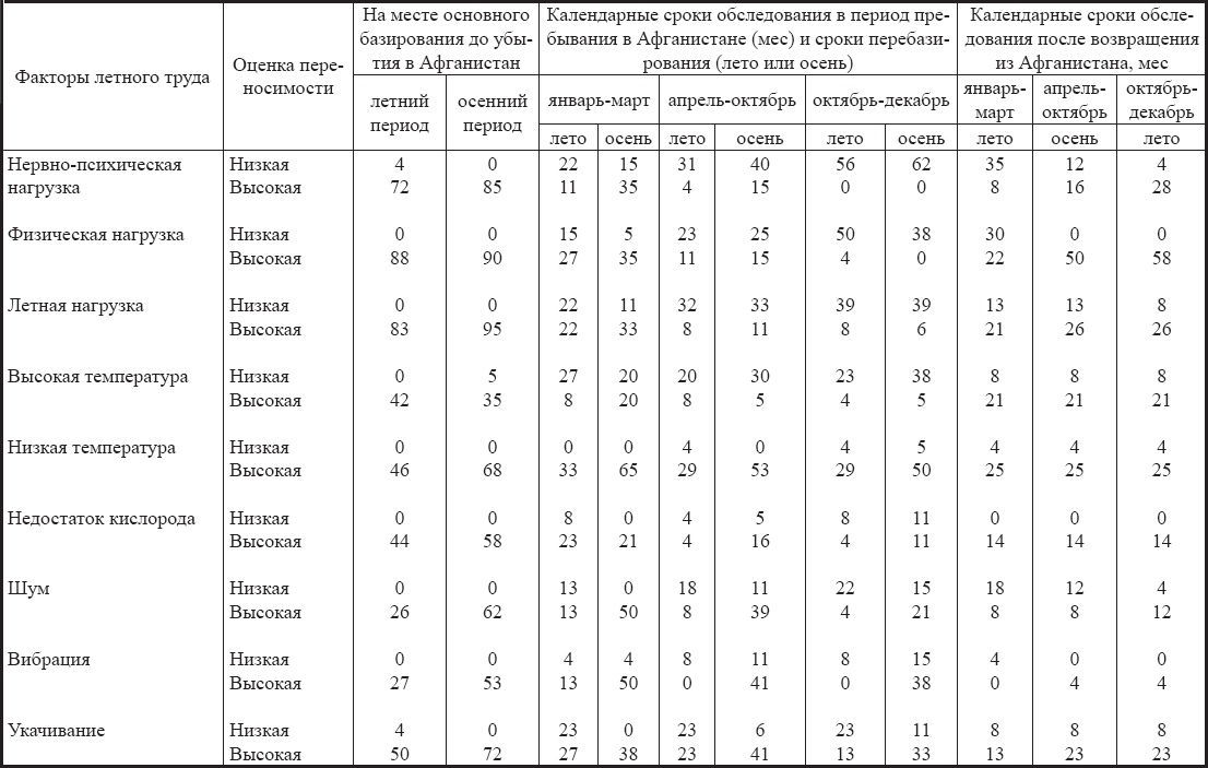 Анализ полученных материалов позволяет сделать вывод о существенном изменении функционального состояния и снижении реактивности организма летчиков в отношении как качества выполнения профессиональной деятельности, так и переносимости неблагоприятных условий среды обитания. К 10–12-му месяцам пребывания в Афганистане число летчиков, отмечавших низкую переносимость летной, нервно-психической и физической нагрузок, и число летчиков, выполнявших полеты на фоне повышенного нервно-психического напряжения, усталости, было примерно одинаковым.