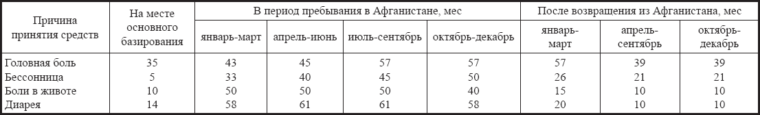 Это подтверждают и данные о характере и частоте жалоб летчиков армейской авиации (%), о неблагоприятном влиянии воздействующих факторов в полете (измененного функционального состояния и среды обитания) на самочувствие и работоспособность в зависимости от сроков замены в летний и осенний периоды года в Афганистане (табл. 2.13). Обращает внимание тот факт, что при замене в летний период года большее число летчиков отмечало в полете жалобы на выраженное нервно-психическое напряжение, усталость, изменение самочувствия (раздражительность, головная боль, боли в области сердца, желудка, одышка и др.). Косвенно о существенном изменении самочувствия в период выполнения полетов и после их завершения говорят данные о неконтролируемом приеме летчиками фармакологических препаратов, направленный на нормализацию сна, работы кишечника, снятие головной боли, к которому вынуждены были прибегать около 85% опрошенных (табл. 2.14).