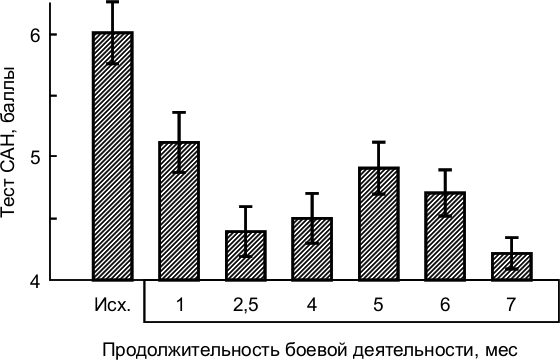 Рис. 2.10. – Зависимость показателей теста САН у летчиков вертолетов Ми-24 от продолжительности участия в боевых действиях