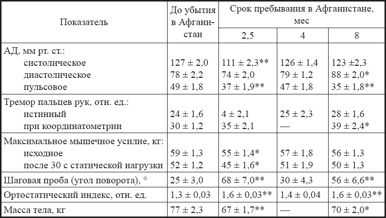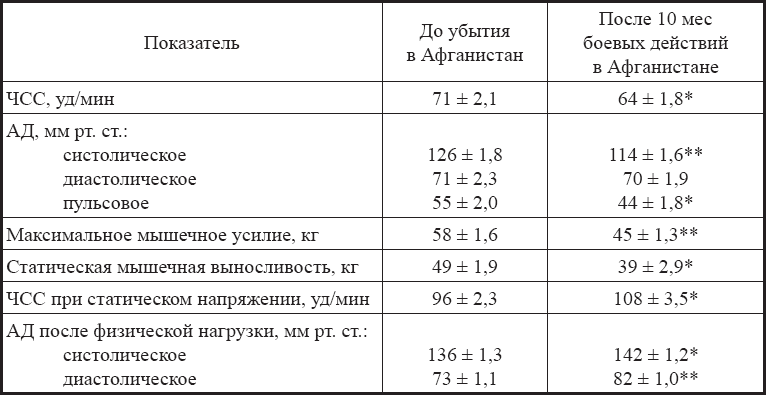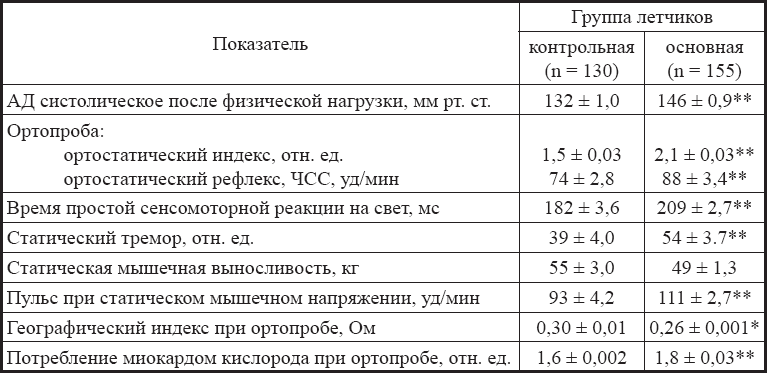 Примечания: 1) контрольная группа – летчики, проходившие службу в Средней Азии, основная – летчики, выполнявшие полеты в Афганистане; 2) приведены средние значения со средним отклонением; 3) звездочкой (*) отмечены достоверные различия по отношению к данным контрольной группы летчиков (р < 0,01).