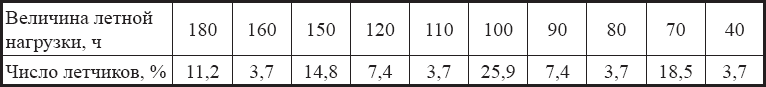 При анализе летной документации установлено, что за 2,5 мес боевой деятельности налет по группам (авиационная эскадрилья) в среднем составил 115 ч. Неравномерное распределение летной нагрузки среди летного состава (табл. 2.16) способствовало развитию в этот период неблагоприятных функциональных изменений.