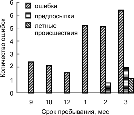 Закономерным следствием снижения работоспособности явилось возрастание ошибочных действий, допускавшихся летчиками на различных этапах боевой деятельности. И хотя в течение первых 4–5 мес за счет резервных возможностей организма и высокой физиологической цены выполнения летной работы удавалось поддерживать относительно стабильный уровень работоспособности, в последующем вследствие развивающегося переутомления количество ошибок на 100 ч налета резко увеличивалось (рис. 2.11).