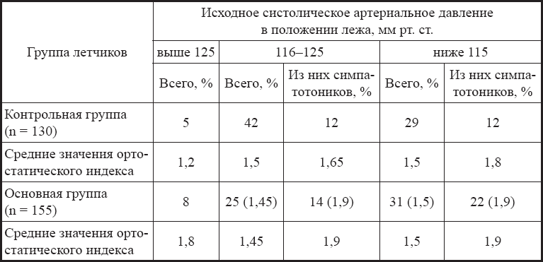 Более подробный анализ состояния летчиков различных групп с учетом систолического артериального давления и оценок реакции на ортопробу приведен в табл. 2.19. При сравнении с контрольной группой выявлены следующие изменения в основной группе: