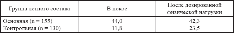 По величине систолического показателя (когда он достигает 50% уровня и более) также отмечены статистически значимые различия в группах. Если в контрольной группе этот показатель не выходил за пределы нормальных значений, то у 19,2% летчиков основной группы он превышал должный уровень, что является неблагоприятным признаком.