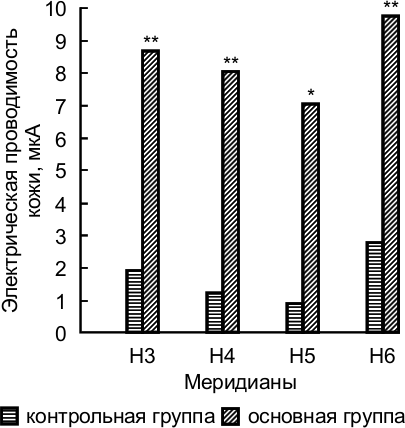 При электропунктурной диагностике установлено, что у летчиков основной группы в биологически активных точках кожи (БАТК) левой и правой ветви меридианов отмечалась выраженная асимметрия электропроводимости (рис. 2.12).