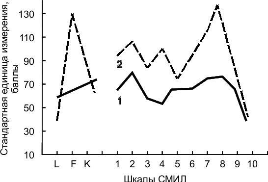 Различия проявлялись при сравнении как формы профиля, так и абсолютных значений шкал. Усредненный профиль, характеризующий личностные особенности летного состава, находившегося в Афганистане, расположен значительно выше 60 F. Достоверные различия наблюдались по 1–5-й и 7-й шкалам, а также по оценочным шкалам L и F.