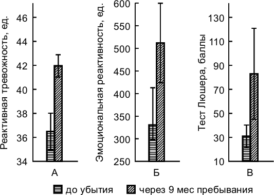 Рис. 2.14. – Динамика реактивной тревожности (а), эмоциональной реактивности (б), теста Люшера (в) у летчиков до убытия и через 9 мес пребывания в Афганистане