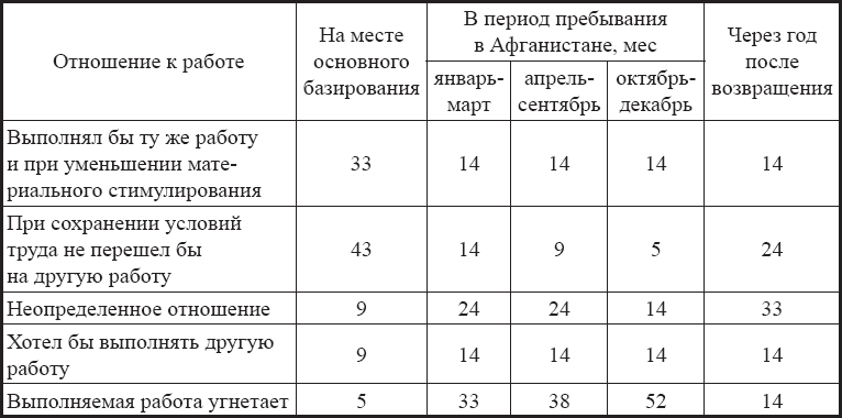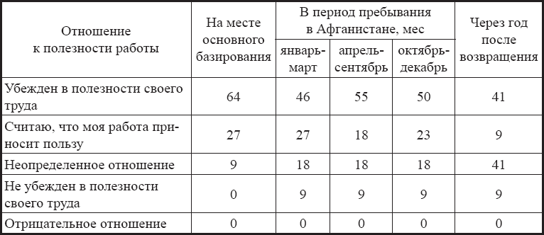 Мотивация к работе в условиях Афганистана формировалась постепенно под влиянием разнообразной информации как позитивного, так и негативного плана. Личностные, социальные, служебные и другие аспекты мотивации также участвовали в ее формировании. К моменту убытия в Афганистан летчик уже имел сформированное отношение к предстоящей деятельности, и экстремальность условий существования, усугублявшаяся социально-бытовыми факторами, завершала создание негативного отношения к летной деятельности в условиях Афганистана. Косвенным подтверждением сказанного является отношение летчиков к содержанию и полезности своей работы (табл. 2.22 и 2.23). Так, если до прибытия в Афганистан 14 % летчиков хотели выполнять другую работу или выполняемая работа их угнетала, то в первые три месяца в Афганистане число таких летчиков составило 47%, а на завершающем этапе к 10–12-му месяцам – 66%. При этом 9% летчиков в Афганистане отмечали, что не убеждены в полезности своей работы.