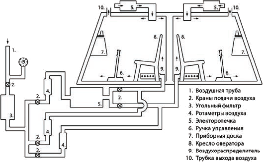 Затем оператор переходил в кабину с высокой температурой окружающей среды в диапазоне 28–70°С. Принципиальная схема и общий вид стенда тренажера представлен на рис. 3.1 и 3.2.