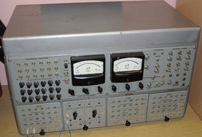 Качество операторской деятельности, выполняемой на стенде-тренажере, оценивалась методом двухмерного компенсаторного слежения за сигналами синусоидальной формы с частотой 0,15×0,15 Гц. Разработка и сопровождение модели слежения проводилось по авторской методике инженера, научного сотрудника Д. А. Арбузова. На первом этапе сигнал задавался прибором МН7, который позже был заменен на более современную модель МН10 (рис. 3.4). Основной проблемой приборов серии МН являлось то, что все они были ламповыми и в течение непродолжительной работы из-за нагрева в них сбивалось положение «нуля». Учитывая эту проблему и развитие научно-технического прогресса, прибор МН 10 был в последствии заменен на аналого-вычислительный комплекс АВК 2/3 (рис. 3.5), в сочетании с выполнением задачи выбора из 2 альтернатив, задаваемой аппаратурой «Физиолог-М». Прибор индикатора НКП-4 находился на расстоянии 60 см от глаз испытателя. Удержание стрелок прибора НКП-4 в заданной зоне диаметром 10 мм производилось посредством подачи электрических сигналов на стрелки прибора при помощи ручки, соединенной с потенциометрами по «крену» и «тангажу». Индикатор блока «Резервы» аппаратуры «Физиолог-М» находился вне поля зрения оператора на том же расстоянии, что и НКП-4. Ответная часть кнопки находилась на уровне левого подлокотника кресла оператора. Перед началом слежения операторы инструктировались о необходимости выполнения в первую очередь слежения, а во вторую – задача «Резервы».