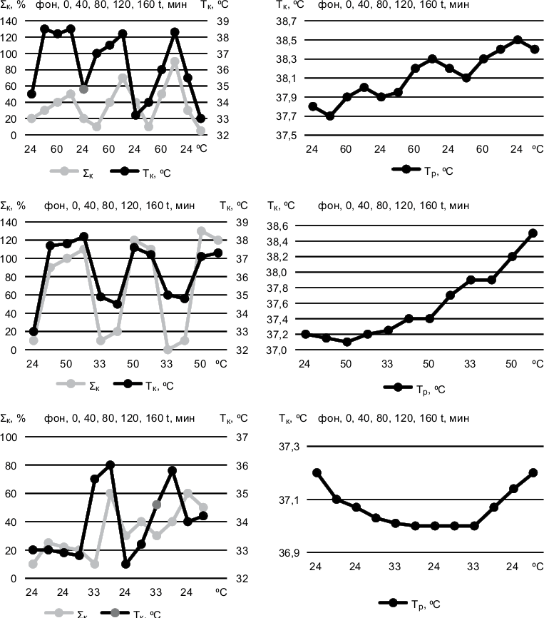 Рисунок 3.12 – Динамика изменения средневзвешенной температуры кожи (Тк), ректальной температуры тела (Тр) и качества управления на тренажере (Σк) при интермиттирующем воздействии высоких температур различной направленности