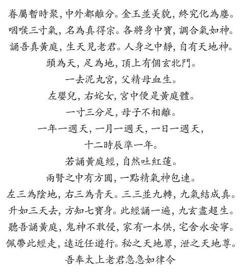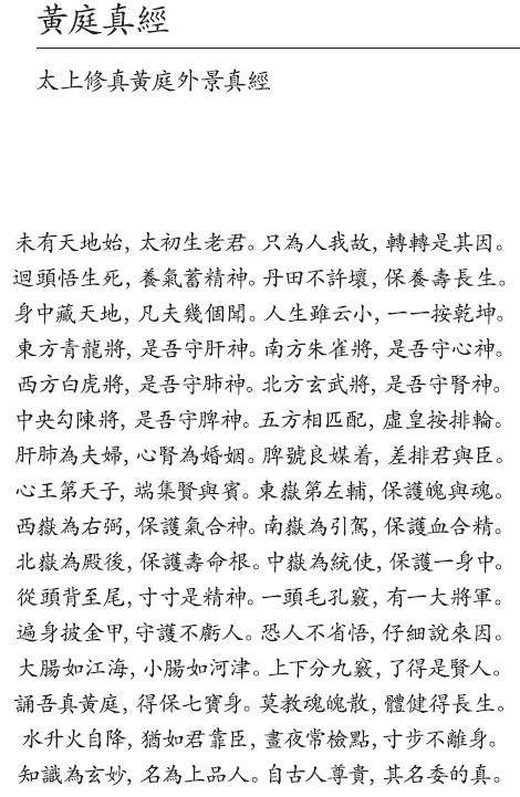 Прежде начала Неба и ЗемлиНачало всех начал рождает Лао-цзюня.Лишь то, что Я всегда исходит из других,Коловращения всего – одна причина.Остановись, прозрей рождение и смерть,Питая ци, копи и квинтэссенцию, и дух.Не дай пропасть полям трем киноварнымИ долголетие лелей для вечной жизни.В тебе самом сокрыты Небо и Земля,Но разве знать дано об этом заурядным?Пусть говорят: век человека краток,Все в нем согласно всеохватным Цяньи Кунь.Востока генерал – Дракон Лазурный,Это во мне хранящий печень дух.На Юге генералом – Красный Феникс,Это во мне хранящий сердце дух.На Западе за генерала Белый Тигр,Это во мне хранитель легких дух.На Севере Иссиня-черный Воин,Это во мне хранящий почки дух.А в Середине генералом Гоу Чэнь,Это мой дух, хранящий селезенку.Все пять сторон взаимно сочтены,Владыкой пустоты порядок задан.Печень и легкие – муж и жена,Сердце и почки – супруги.Из селезенки – отличная сваха,По рангу получат – и государь, и слуги.Правитель-сердце равен Сыну Неба,Вокруг него – таланты и вассалы.Восточный пик – его помощник слева,Стоит на страже душ – и по, и хунь.Пик Западный – это помощник справа,Стоит на страже ци, а также духа.Пик Южный – направляющий-ведущий,На страже квинтэссенции и крови.Пик Северный является тыламиНа страже корня долголетия и жизни.Срединный пик – объединитель всех и всяСтоит на страже всего тела в целом.С начала самого запомни до конца:Здесь в каждом цуне —квинтэссенция и дух.И в голове тогда за каждой порой кожиПоявится великий полководец.И тело будет как в доспехах золотыхХранить неуязвимость человека.Страшась, что люди так и не прозреют,Подробно разъясняю все причины.Вот толстая кишка – моря и реки,Вот тонкая – озера и ручьи.Вверху, внизу – всего отверстий девять,Постигший их – мудрейший человек.Читая наизусть мой истинный канон,Ты обретешь семь драгоценностей телесных.Рассеянье грозить не будет по и хунь,И станет крепким тело, долговечным.Чтобы Вода шла вверх, а вниз Огонь,Чтобы на слуг мог опереться государь,Отслеживай и днем и ночью постоянно,Не отвлекаясь ни на цунь и ни на шаг.Владеют знанием как сокровенной тайной,С ним называют человеком высшей пробы.С глубокой древности таких чтут люди,И абсолютно верно это имя!На время сводит домочадцев и родных —Всегда разведены внутри-снаружи.Нефрит и золото, красавицы черты —В конце концов все обратится в пыль.Всего три цуня ци в проеме горла,А называют обретеньем предка.Для каждой части тела драгоценность,Гармонизирующая ци и дух.Читая наизусть мой «Желтый двор»,Вознесшись, предстаешь пред Лао-цзюнем. Когда в покое человеческое тело,В нем есть и Небо, и Земля, и дух.Голова – это Небо,Ноги – это Земля,На макушке врата сокровенного женского.Стоит попасть во дворец Ни вань гун,Семя отца, матери кровь порождают.Слева – младенец,Справа – дева,А во дворце уже сам желтый двор.Лишь один цунь и три фэня,Как мать с сыном, они неразлучны.За год проходит небесный цикл,За месяц – небесный цикл,День один – тоже небесный цикл.В двенадцати стражах весь год.И если читаешь канон «Желтый двор»,На губах красный лотос цветет.Между почками, там где квадрат и круг,Цзин и ци приводят вместилище духав движение.Три слева – это иньская Земля,Три справа – это голубое Небо.Три на три – через девять оборотов,А девять ци – для претворенья в истине.Надо подняться за пределы трех Небес