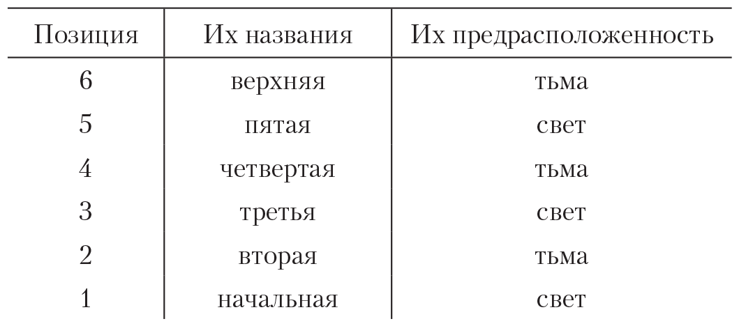 В верхней и в нижней триграмме аналогичные позиции имеют ближайшее отношение друг к другу. Так, первая позиция стоит в отношении аналогии к четвертой, вторая – к пятой и третья – к шестой.