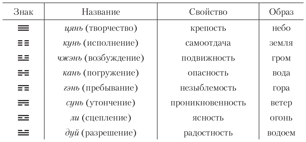 Уже в древнейших комментариях к «Книге Перемен» указывается, что первоначально было создано восемь символов из трех черт, так называемые триграммы. Они получили определенные названия и были прикреплены к определенным кругам понятий. Здесь мы указываем их начертания и их основные названия, свойства и образы: