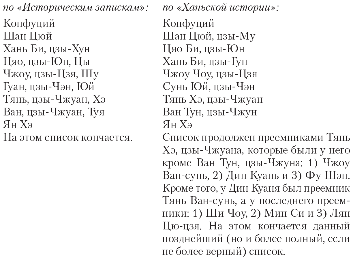 Так мы видим, что работа Наитō проливает некоторый свет на историю составления гексаграмм. На ряде других вопросов, важных для изучения нашего памятника, Наитō не останавливается, потому что они изучены были уже прежде в работе Нариюки Хонда. Эта работа впоследствии была соединена им с рядом других его статей и издана как глава упоминавшейся уже книги «История китайского классицизма». Хонда начинает главу о возникновении «Книги Перемен» с указания на два списка традиции памятника. Один список помещен в отделе «Биографии учеников Конфуция» «Исторических записок» Сыма Цяня, другой – в отделе «Биографии конфуцианцев» «Истории Хань». Они не идентичны как в последовательности имен, так и в их выборе, но и тот и другой начинаются с Конфуция. Это указывает лишь на то, что при Ханьской династии «Книга Перемен» уже была тесно связана с именем Конфуция, но это, конечно, еще не неоспоримое доказательство знакомства Конфуция с нею. Мы увидим, почему нет оснований связывать «Книгу Перемен» с Конфуцием, здесь же изложим взгляды Хонда.