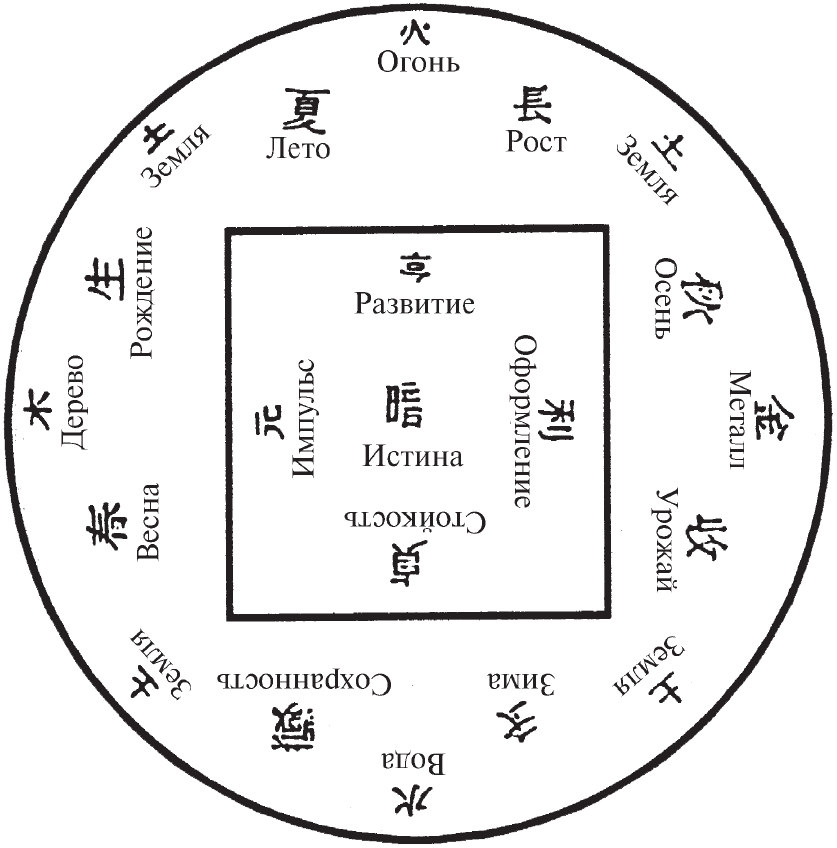 В комментаторской литературе существуют две системы объяснения этих терминов. Одни комментаторы (например, Чжу Си) формулу из четырех знаков юань-хэн ли-чжэн сочетают попарно и, связывая их с названием гексаграммы в целое предложение, полагают, что это два сказуемых к общему подлежащему – названию гексаграммы. В таком случае получается фраза цянь юань хэн ли чжэн, которую (принимая во внимание глоссы Чжу Си) следует перевести так: «Творческое Небо есть великое всепроницание и должная непоколебимость». Однако с таким пониманием трудно согласиться, так как слишком развитая в грамматическом отношении конструкция вряд ли возможна в таком архаическом тексте[118]. Другие комментаторы (например, Чэн И-чуань, продолжающий в этом отношении традицию Ван Би и комментария «Вэнь-янь-чжуань», а также и маньчжурский перевод «Ицзина» «Хани араха убалямбуха чжичжунга номунь») рассматривают эти четыре слова как отдельные, не связанные в контекст фразы. Это, полагают они, лишь перечисление четырех качеств творчества. Исходя из этой традиции, японский философ Кумадзава Бандзан (1619–1692) создал даже целую теорию о космическом проявлении этих четырех качеств творчества. Он приводит следующую схему своей космогонии (см. рис.).