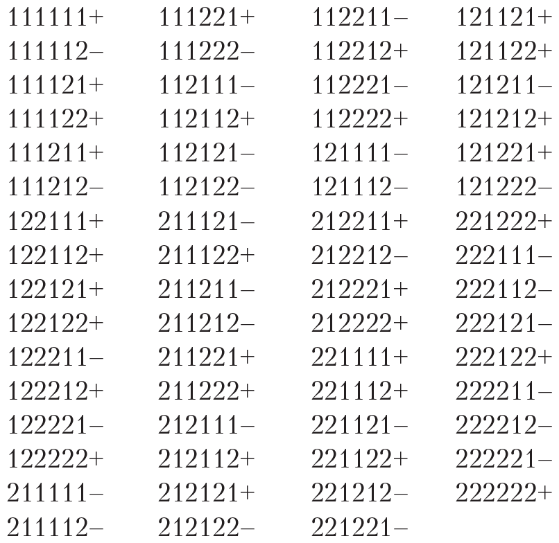 Точка зрения этой комментаторской школы на «четыре качества» ближе к действительности, чем чжусианское понимание их. Однако я не могу целиком согласиться с такой интерпретацией, ибо эти «четыре качества», если их понимать в духе Кумадзава, представляют собой настолько систематическое развитие творческого акта, что невозможен пропуск ни одного из этих звеньев творчества. Конечно, в сунской философии (например, у Чжоу Дунь-и) эти термины так и понимались: 1) импульс, необходимый для того, чтобы творческий акт сущего устремился к проявлению в меоне; 2) проницание (-развитие) сущего в меон; 3) оформление (-определение) сущего меоном и 4) стойкость уже сотворенного. Но именно эта систематичность не допускает пропуска какого-нибудь из этапов творчества. Если бы это понимание «четырех качеств» было верным в приложении к «Книге Перемен», то «четыре качества» появлялись бы в тексте только все вместе. Но так ли это? Следующая схема дает наглядный пример того, насколько несистематично появление терминов юань, хэн, ли, чжэн в древнейшем слое основного текста. (В этой схеме гексаграммы обозначены условно числами, где «1» передает целую черту, а «2» – прерванную; первая цифра слева соответствует нижней черте гексаграммы, а крайняя правая цифра – верхней черте. Так превращенные в цифры гексаграммы могут быть расположены в систематическом порядке, в котором нетрудно найти любую из них.) Знак «–» означает отсутствие четырех качеств, «+» – присутствие их.
