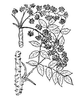 Народное название «шип-дерево». Небольшое деревцо 1,5–5 м высотой, ствол обычно неветвистый, усажен многочисленными острыми шипами. Листья крупные, около 1 м длиной. Цветки мелкие, невзрачные, беловатые. Плоды сочные, костянковидные, почти черные, с 5 косточками.