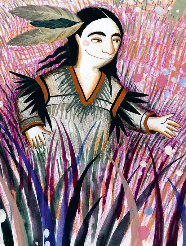Старушка достала корзинку и вынула из неё четыре пёрышка. – Согласно представлениям многих индейских племён, перья некоторых птиц обладают могучей силой. В этой сказке перья связаны и с цветовой символикой, имеющей отношение к духам – покровителям четырёх сторон света, которые помогают герою.