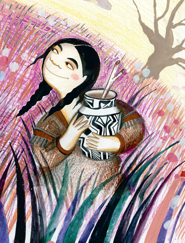 Близились холода. Готовясь к зиме, Маленький Цветок каждый день уходил в горы охотиться на оленей. Как-то утром ушёл он из дому, а Белая Кукуруза взяла кувшин и отправилась за водой на озеро Зелёных Ив. Наполнила она кувшин доверху и вдруг заметила под водой волшебную палочку. Потянулась за ней и достала.