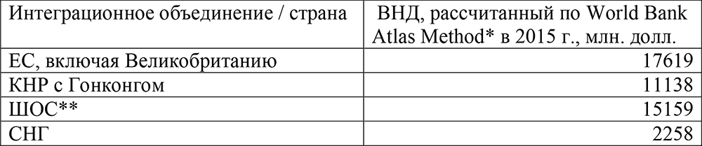 ** – в составе ШОС учтены государства-члены ШОС без государств-наблюдателей и партнеров по диалогу. Если учесть и эти две категории стран, то суммарный ВНД составит 16739 млн. долл.