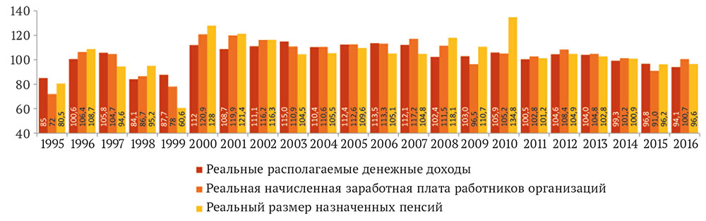 Рис. 1. Динамика реальных располагаемых денежных доходов населения, реальной начисленной заработной платы и реального размера назначенных пенсий в 1995-2016 гг., % к предыдущему году