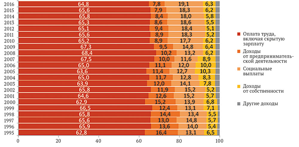 Рис. 2. Структура денежных доходов населения, 1995-2016 гг., %