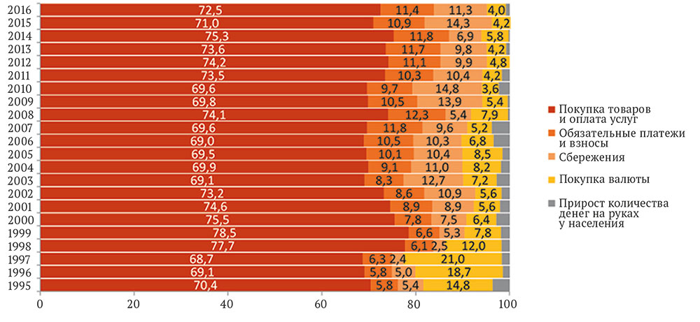 Рис. 3. Структура использования денежных доходов населения, 1995-2016 гг., %