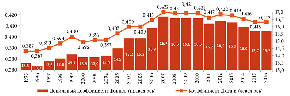 Рис. 5. Уровень доходного неравенства, 1995-2016 гг.