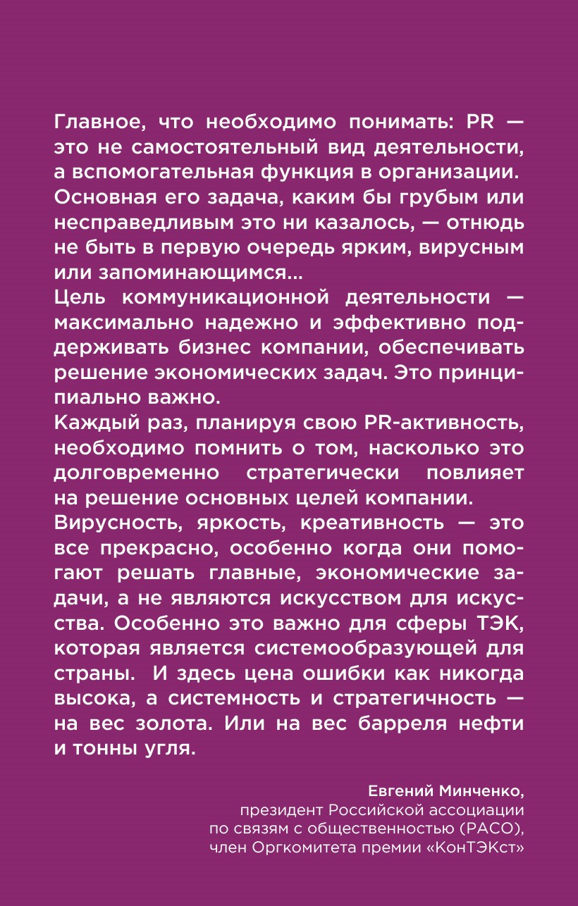 Книга «30 лучших коммуникационных проектов ТЭК» – это уникальный проект, который объединил многолетний опыт ведущих компаний топливно-энергетического комплекса в различных направлениях коммуникационной деятельности. Это квинтэссенция лучших отраслевых коммуникационных практик, технологий и инструментов. Вы держите в руках уникальный учебник, который поможет вам решить практически любую задачу компании, подскажет новые идеи, снабдит самыми эффективными инструментами и технологиями.