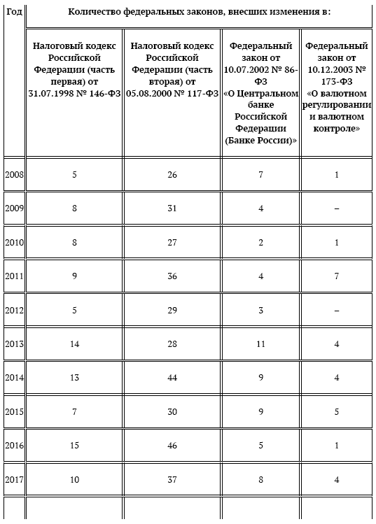 Важной для финансового права является и проблема влияния цифровизации на ее источники. Так, например, Т. Я. Хабриева и Н. Н. Черногор отмечают воздействие рассматриваемого процесса на форму права в целом. В частности, авторы указывают на то, что у формально-юридических источников права, таких как нормативный правовой акт, договор нормативного содержания и др., появляется «виртуальный дублер», «цифровой двойник», который может в точности совпадать по форме и содержанию с официальным текстом, изданным, оформленным и обнародованным по всем правилам, но может отличаться от оригинала… Интересно и то, что оцифровка формально-юридических источников права приводит к формированию новых приемов и способов юридической техники, в частности отсылок к ранее действующей редакции нормативного правового акта или его части, к другим нормативным правовым актам, судебным решениям, официальным письмам и др.»13. Перечисленное ведет к упрощению поиска необходимой в практической деятельности юриста информации. В то же время, по нашему мнению, цифровизация имеет еще одно важное следствие – интенсификацию нормотворческой деятельности. Данный вывод может быть проиллюстрирован нижеследующей таблицей, в которой отражена информация о количестве принятых федеральных законов, вносящих изменения в важнейшие источники финансового права, с разбивкой по годам.