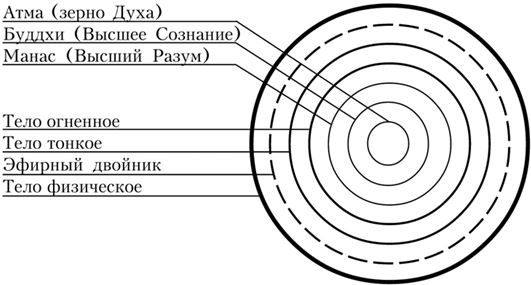 Из материи всех миров человек строит свои тела. Три высших тела человека: зерно Духа (Атма), тело Высшего Сознания (Буддхи) и тело Высшего Разума (Манас) составляют высшую триаду человека, его бессмертную душу. Это то, что является результатом эволюции человека во всех состояниях, предшествовавших человеческой форме: элементальной, минеральной, растительной и животной, а также во всех уже человеческих жизнях в нашем мировом периоде (Манвантаре).