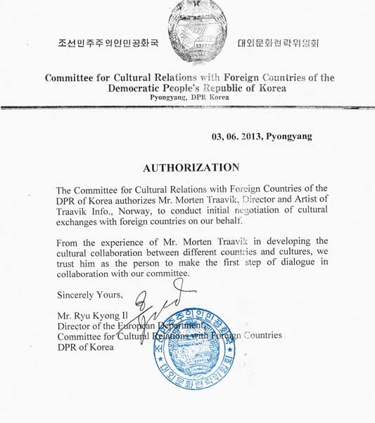 Комитет по культурным связям с зарубежными странами КНДР дает Мортену Тровику, режиссеру и художнику Traavik Info., Норвегия, право проводить первоначальные переговоры о культурном обмене с зарубежными странами от нашего имени.