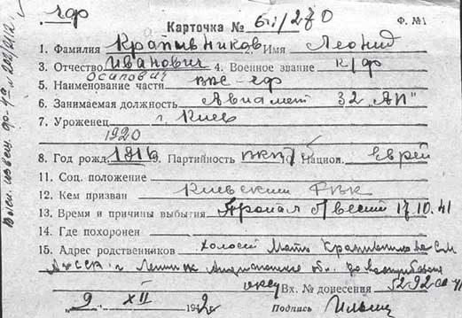 В декабре 1941 года мать Софья Михайловна, находясь в эвакуации в Средней Азии, получила извещение, что сын пропал без вести 19 сентября. А в донесении о потерях написали: «Не вернулся с боевого задания 13.IX.41».