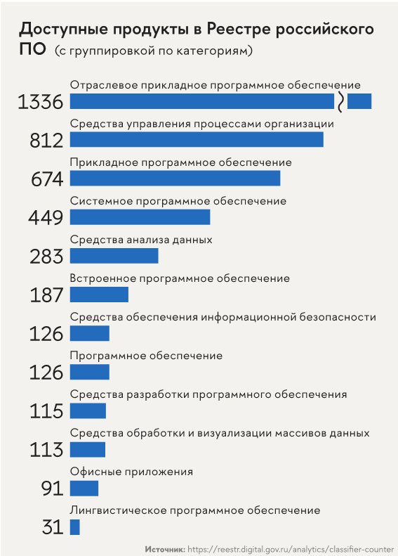 Сегодня на российском рынке представлено значительное количество отечественных ИТ-решений. В 2022 году в Реестре российского ПО было зарегистрировано около 15 тыс. продуктов отечественных разработчиков, которых в целом по стране насчитывается порядка 4,2 тыс. При этом в Реестре доступно ПО различных категорий (см. график). Спрос на российское ПО вырос на 300 % относительно 2021 года, причем в отдельных сегментах наблюдалась гораздо более сильная динамика[3].