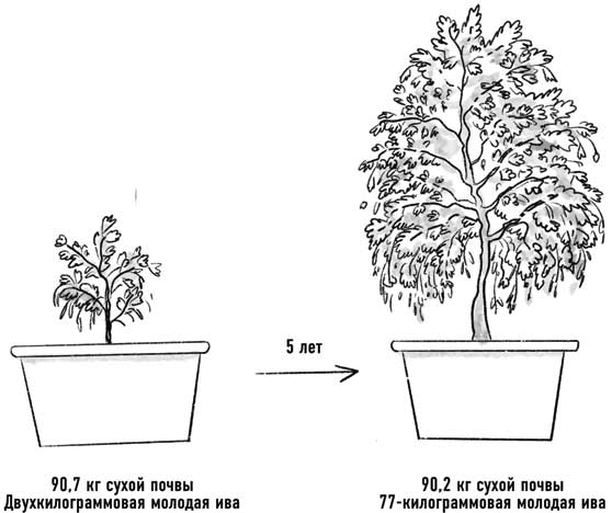 Когда-то считалось, что растения используют в пищу почву и формируются из нее. Но в XVII веке голландский ученый Ян Баптиста ван Гельмонт решил подтвердить (или опровергнуть) это экспериментально. Он посадил в горшок с 90,7 кг почвы двухкилограммовый росток ивы и пять лет наблюдал за ним. Деревце росло, крепло. Ван Гельмонт заботливо поливал его и отмечал, как быстро растет его подопечный. Когда прошло пять лет и горшок стал мал для подросшего дерева, ученый решил, что время пришло. Он достал иву из него и взвесил ее. Теперь она весила 77 кг. На 75 кг больше! Откуда они взялись? Может быть, из почвы? Но ее масса почти не изменилась и осталась около 90 кг. Получается, эти 75 кг нового вещества взялись откуда-то еще.