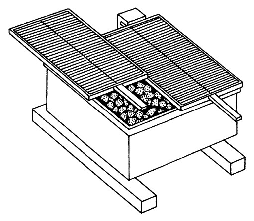Современный процесс приготовления пищи с помощью мангала, гриля и барбекю является в основном праздничным мероприятием. С наступлением теплых дней люди выезжают на природу, где, как правило, устраиваются пикники с приготовлением всеми любимого блюда – шашлыка с дымком. Да и грибники, и рыбаки, и охотники не прочь приготовить еду на угольках. Надо заметить, что шашлыки и аналогичные блюда нельзя готовить на открытом огне. Готовят только на горячих углях костра, гриля, барбекю или мангала. Родоначальником гриля и барбекю является очень популярный в народе простейший мангал (рис. 1). Мангал представляет собой стальной жаропрочный ящик прямоугольной формы, в нижней части которого имеются несколько отверстий для поступления воздуха. Эти отверстия необходимы для разжигания мангала и тления углей. Однако, регулировать тягу с помощью таких отверстий не всегда удается. Поэтому на практике тягу регулируют с помощью интенсивного обмахивания остывающих углей картонкой или сложенной в несколько слоев газетой. На дно мангала кладутся угли, примерно до середины стенок мангала, и поджигаются.