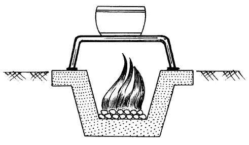 Если же надо приготовить первое блюдо (уха и т. д.), то это обычно делается на открытом огне (на костре), где котелок размещается или подвешивается на перекладине (рис. 4).