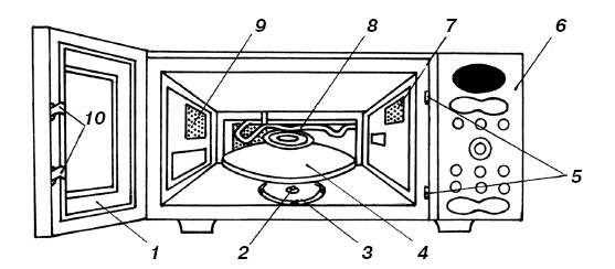 1 – дверца; 2 – муфта; 3 – роликовая подставка; 4 – вращающийся поднос; 5 – блокировочные контакты; 6 – панель управления; 7 – освещение; 8 – нагревательный элемент гриля; 9 – вентиляционные отверстия; 10 – защелки дверцы