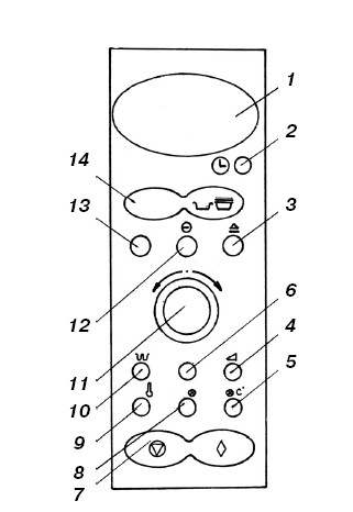 1 – дисплей; 2 – установка времени; 3 – корректировка времени; 4 – выбор уровня мощности; 5 – выбор температуры; 6 – режим "микроволны+гриль"; 7 – "стоп/отмена"; 8 – "микровалны+горячий воздух"; 9 – предварительный прогрев; 10 – "гриль"; И – выбор веса порции и рецепта; 12 – выбор функции приготовления; 13 – время выдержки; 14 – режим автоматического размораживания