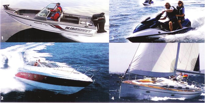 Примеры маломерных судов: 1 – моторная лодка (мотолодка); 2 – катер; 3 – гидроцикл; 4 -парусная яхта