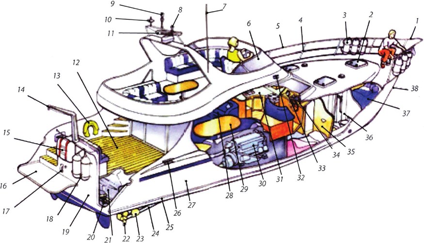 1 – Носовой релинг; 2 – Форлюк; 3 – Кранцы; 4 – Леерноя стойка; 5 – Леерное ограждение; 6 – Штурманский мостик; 7 – УКВ антенна; 8 – GPS антенна; 9 – Навигационные огни; 10 – Телевизионная антенна; 11 – Радиолокационная антенна; 12 – Кормовая палуба; 13 – Спасательная подкова; 14 – Шлюпбалка; 15 – Спасательный плот; 16 – Платформа для купания; 17 – Палубный душ; 18 – Кранцы; 19 – Транец; 20 – Механизм рулевого привода; 21 – Топливный танк; 22 – Гребной винт; 23 – Кронштейн гребного вала; 24 – Гребной вал; 25 – Ватерлиния; 26 – Утка; 27 – Надводный борт; 28 – Кают-компания; 29 – Обеденный стол; 30 – Правый двигатель; 31 – Камбуз; 32 – Правый бортовой огонь; 33 – Контрольно-измерительные приборы; 34 – Навигационные приборы; 35 – Каюта; 36 – Гальюн с душем; 37 – Носовая каюта – кубрик; 38 – Форштевень.