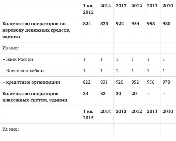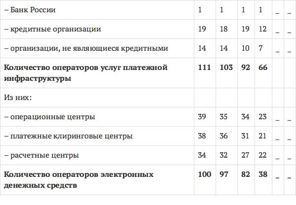 Сокращение количества операторов по переводу денежных средств произошло за счет снижения количества действующих кредитных организаций. Операторы платежных систем пополнились за счет присоединения кредитных организаций к той или иной платежной системе. Также произошло увеличение количества организаций, относящихся к оказанию услуг в платежной инфраструктуре, таких как платежные клиринговые центры, операционные и расчетные центры.