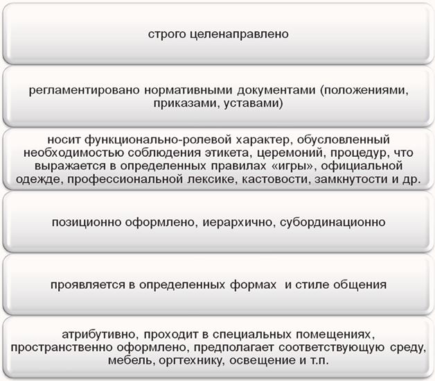 Деловое общение – особый вид общения, направленный на организацию и оптимизацию сотрудничества людей в трудовом процессе. Деловое общение обеспечивает ведение переговоров, деловых совещаний и официальной переписки, публичных выступлений. В конкретной профессиональной области деловое общение имеет специфику и называется профессиональным. При профессиональном общении субъектами общения являются представители однородных профессиональных групп, которые решают единые задачи, используют принятую в данной сфере терминологию. При этом деловое общение – более широкое понятие. В деловом общении для участников важен результат, достижение цели. Деловое общение отличается нормированным характером и деловой целесообразностью. На рисунке 4 представлены признаки делового общения по А.Н. Сухову[7].