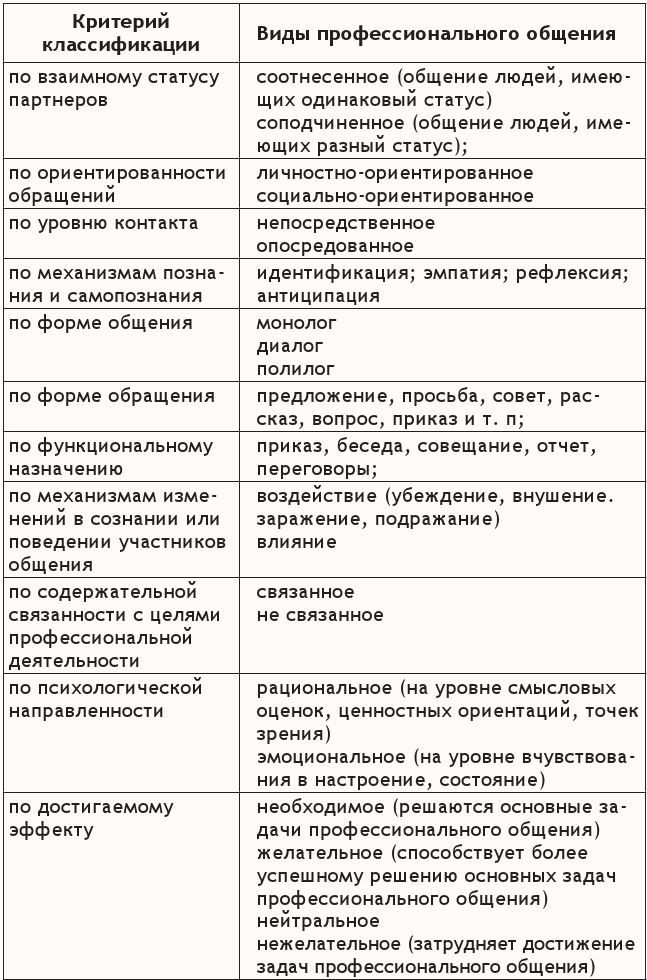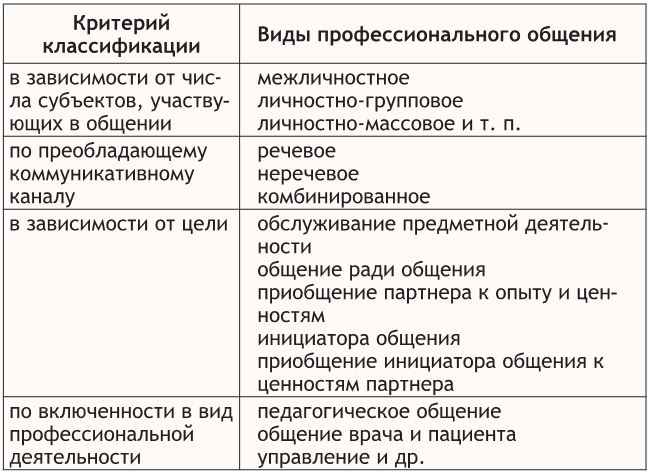 Существуют различные классификации профессионального общения. В таблице 2 представлены виды профессионального общения и критерии их выделения. Выбор того или иного вида общения участниками профессионального взаимодействия зависит как от содержания профессиональной деятельности в целом, так и от конкретной профессиональной ситуации.