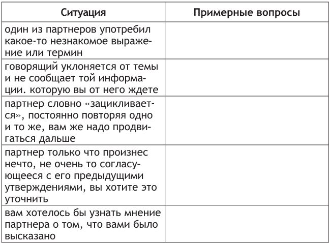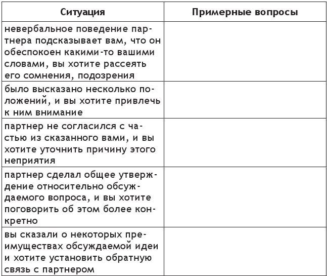 Задание 5. Установите обратную связь, проверьте точность восприятия информации или узнайте дополнительную информацию с помощью вопросов[11].