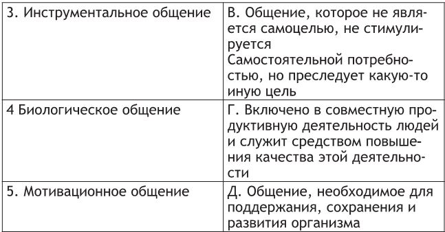 Задание 3. Определите виды общения, актуализирующиеся в следующих ситуациях. (Вариантов ответа может быть несколько.) а) Оказавшись в скучной компании, парень рассказывает веселые истории и анекдоты. б) Заметив знакомую, идущую по другую сторону дороги, девушка приветливо улыбнулась ей и помахала рукой. в) Покупатель интересуется у продавца ценой и качеством товара. г) Мэр города обращается по радио к горожанам с призывом принять активное участие в субботнике. д) Просматривая образцы обоев, супруги рассуждают, какие из них лучше подойдут для детской комнаты. е) Отец рассказывает сыну, как из бумаги можно сделать самолетик. ж) Продавец пылесосов, привлекая внимание потенциальных покупателей, демонстрирует достоинства товара и сообщает, что цена на следующую партию будет уже выше.